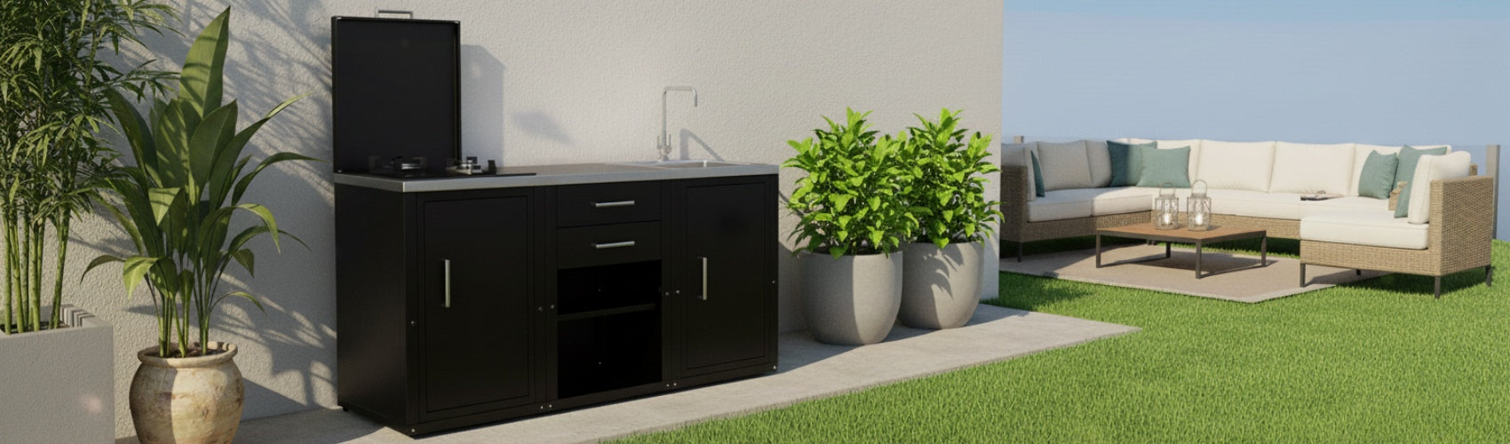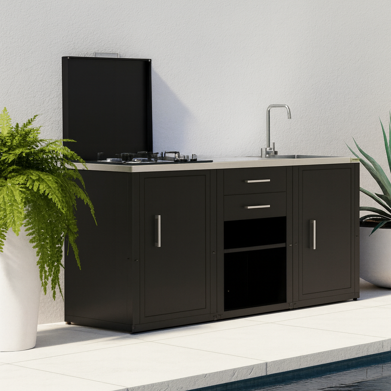 Set Cucina da Esterno a Gas 2 Elementi con Lavello rubinetto e tagliere incassato - Struttura in Acciaio e Piano in Acciaio Inox - Nero Rendi unica...